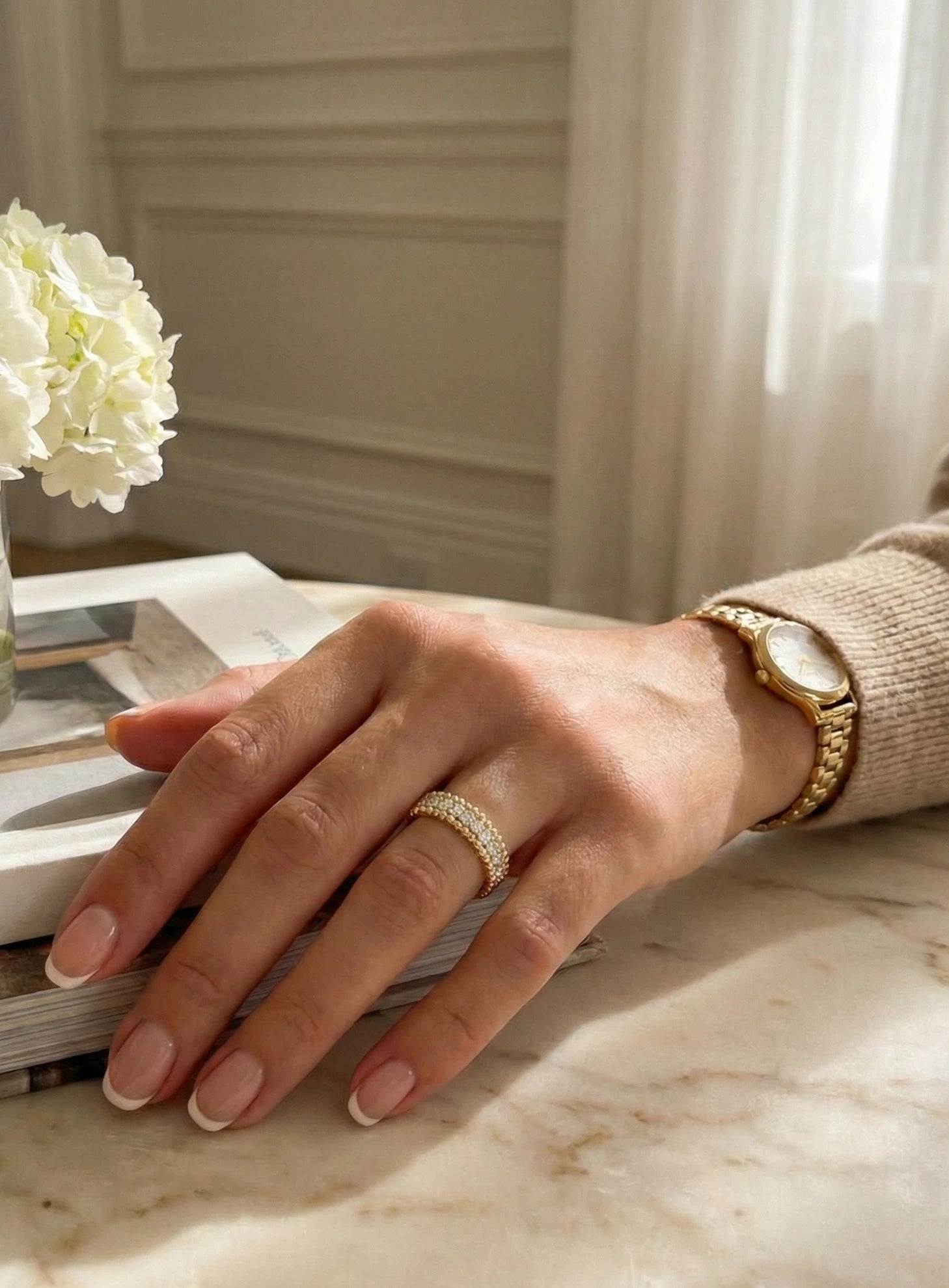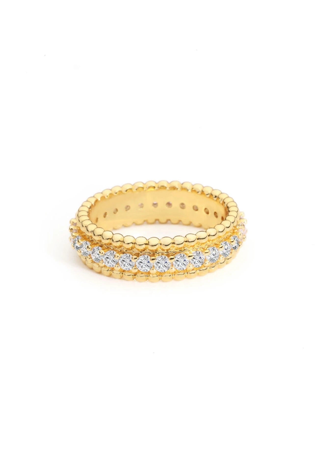 The Acantha Ring is where modern boldness meets classic luxury. Featuring a luxe row of precision-set crystals embedded into a wide, confident band, this piece is the definition of a "power accessory." Designed to be a statement-maker that truly goes with everything, the Acantha adds a sophisticated sparkle to your hand-stack that won't go unnoticed.