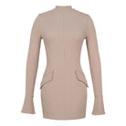 The "Wildflower" is a beautifully constructed, form-fitting stretch dress designed to sculpt and flatter the natural lines of the body. Its sleek, minimalist silhouette is elevated by sophisticated decorative flap pockets and dramatic fluted cuffs that add a touch of high-fashion flair.