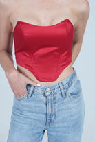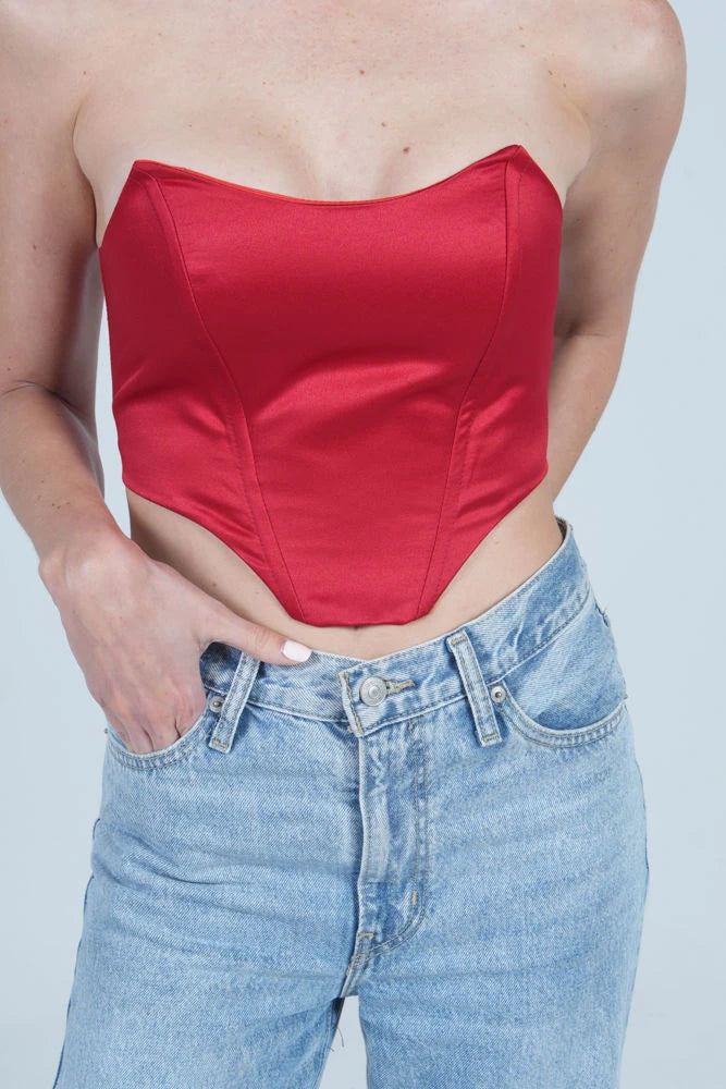 Turn heads in our "Call Me Revenge" corset. Crafted from luxurious red Duchess satin, this strapless, fully boned piece features a classic corseted bodice to create a tiny waist and a flattering, curved neckline that follows the natural contours of your frame.