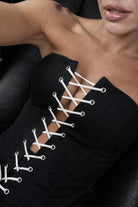 Our classic black strapless corset features a striking white lace-up detail at the front, enhancing the silhouette. A timeless statement piece, the Supergirl elevates any look with minimal effort. Cut in a structured silhouette, it enhances the waist and creates a clean, sculpted shape.