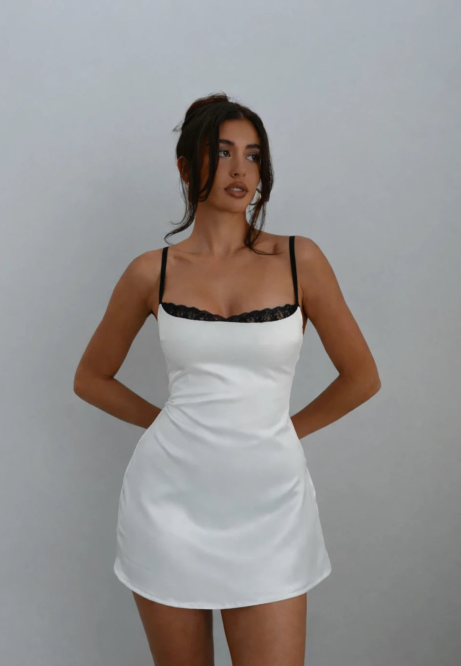Σας παρουσιάζουμε την αναβαθμισμένη εξέλιξη του best-seller σατέν μίνι φόρεμα. Το "That's My Name" συνδυάζει τη διαχρονική κομψότητα με μια μοντέρνα, ρομαντική πινελιά. Με ένα λεπτό μαύρο δαντελένιο τελείωμα στο στήθος και κομψά μαύρα ελαστικά τιράντες, αυτό το φόρεμα προσφέρει μια εντυπωσιακή αντίθεση με την κομψή λευκή σατέν βάση του.